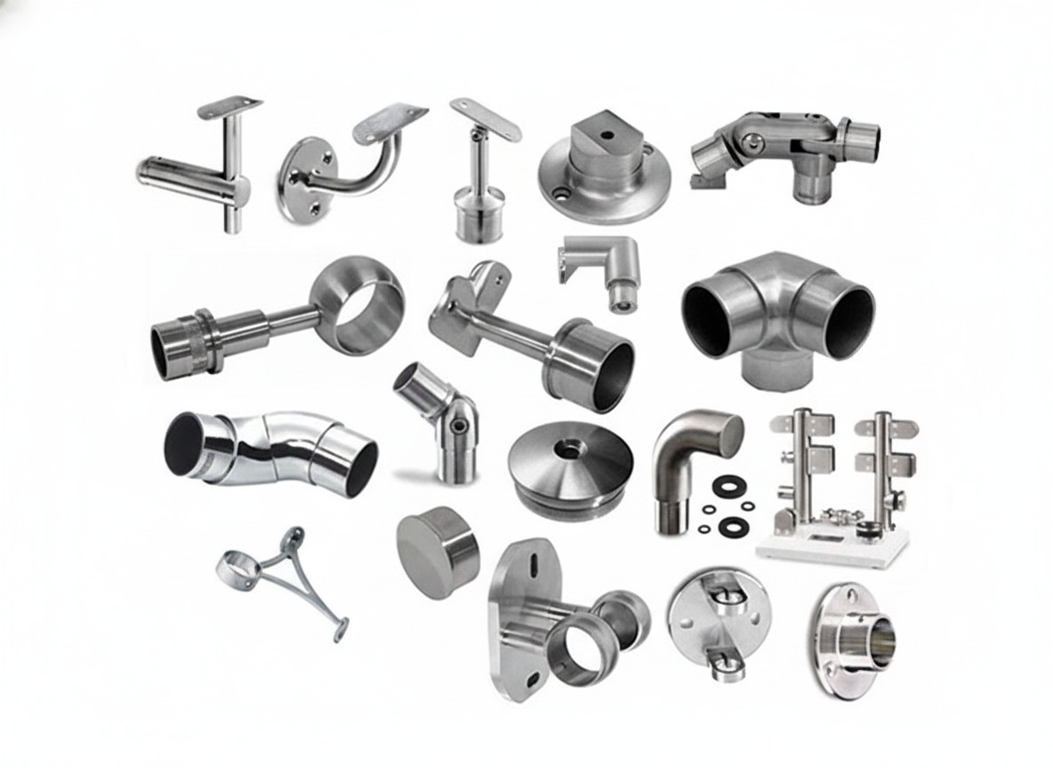 قطع معدنية معمارية عالية الجودة للواجهات الحديثة، تشمل مثبتات الزجاج ووصلات الدرابزين ومقابض الأبواب، مصنوعة من ستانلس ستيل متين للاستخدام في الواجهات والسلالم والديكورات.